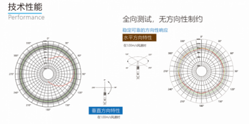 JT1411 wind speed sensor probe is omnidirectional response, this performance is especially important for wind speed measurement of unknown wind direction or unstable wind direction, random wind direction, JT1411 has excellent directional response characteristics in the horizontal direction, at different angles (the wind direction is perpendicular to the probe Direction) can maintain fast response and accurate measurement of the incoming wind direction.