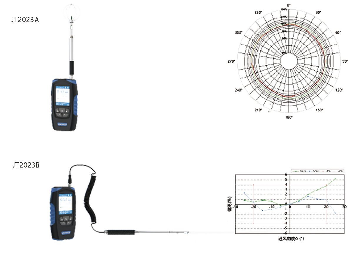 JT2023 Wind speed meter adopts thermal wind speed probe, its working principle is wind cooling principle, can choose omnidirectional (non-directional) (JT2023A type) or directional wind speed probe (JT2023B type), omnidirectional wind speed probe does not need to rotate during measurement The correct reading can be obtained only in the direction of the probe, and the directional wind speed probe needs to rotate the probe during measurement to find the maximum reading in order to read the correct measurement value.